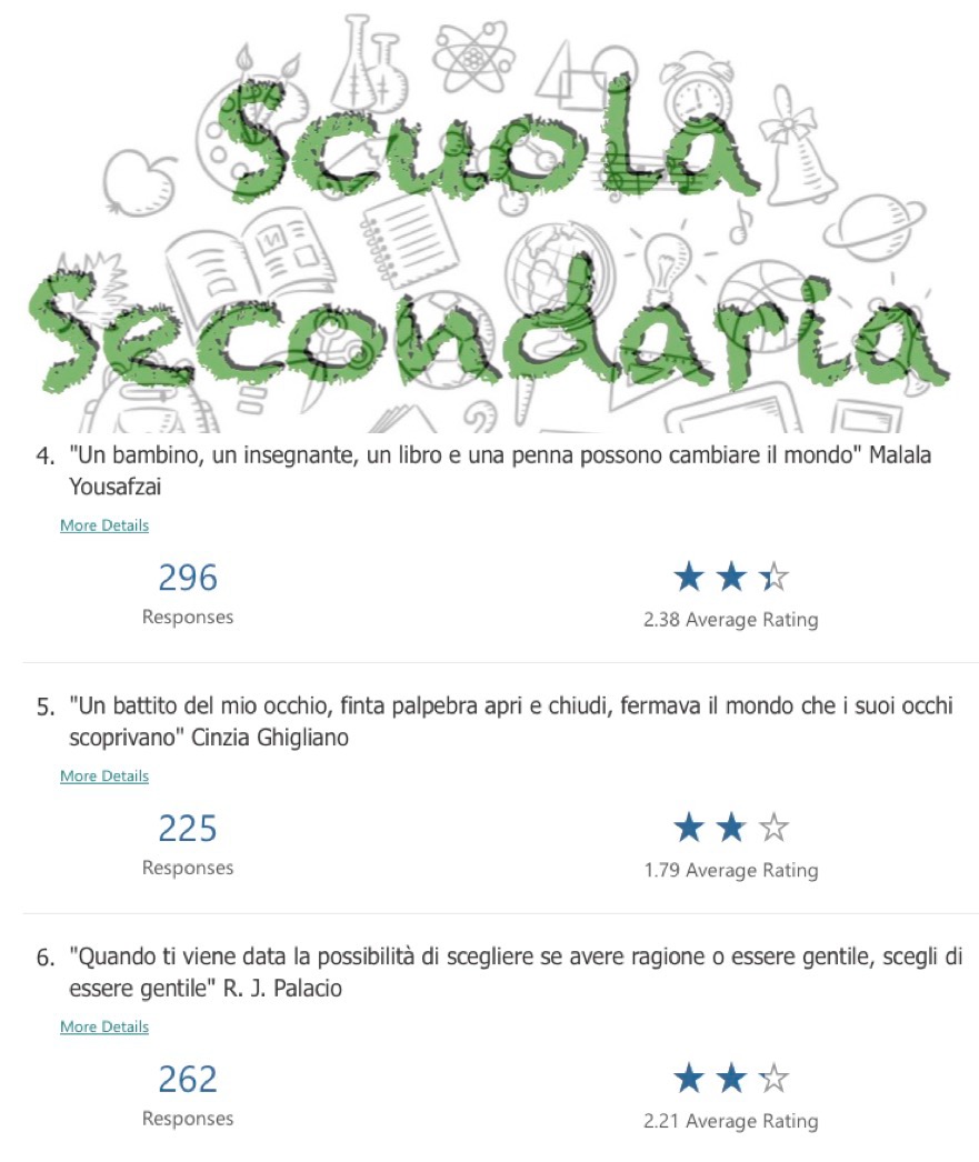Ecco i risultati delle votazioni raccolte il 23 aprile, giornata mondiale del Libro. Ora riporteremo le frasi vincitrici sulle pareti degli atri delle nostre scuole. Grazie a tutti!