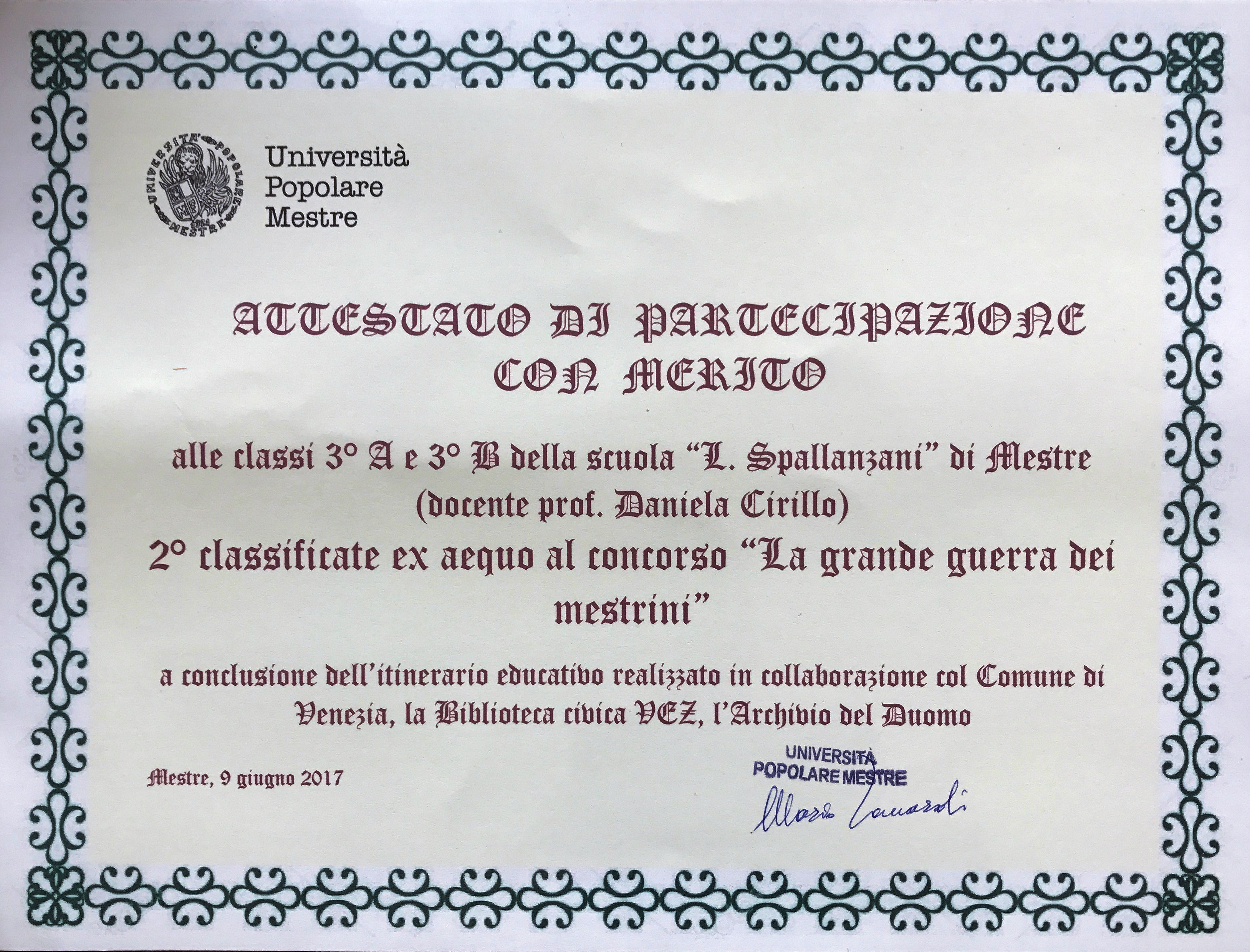 In occasione del centenario della Grande Guerra le classi 3A e 3B dell’Istituto L. Spallanzani di Mestre hanno aderito all'Itinerario Educativo "La Grande Guerra dei mestrini" e al Concorso omonimo indetto dall'Università Popolare di Mestre classificandosi secondi.