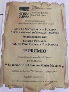 Le classi 3A e 3B hanno partecipato al concorso bandito dalla Regione Veneto "la Grande Guerra. Una storia nella Storia" e hanno effettuato una ricerca su un memoriale scritto dal tenente Mario Muccini dal titolo “Ed ora andiamo! Il romanzo di uno scalcinato” testo ormai introvabile e fuori commercio.