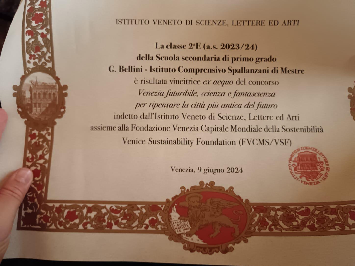 Domenica 9 giugno 2024, nel corso dell’adunanza solenne dell’Istituto Veneto di Scienze, Lettere ed Arti alla Sala dello Scrutinio di Palazzo Ducale a San Marco, la classe 2E della scuola secondaria Bellini è stata premiata per il concorso indetto da IVSLA e dalla Fondazione Venezia Capitale Mondiale della Sostenibilità “Venezia futuribile, scienza e fantascienza per ripensare la città più antica del futuro”.